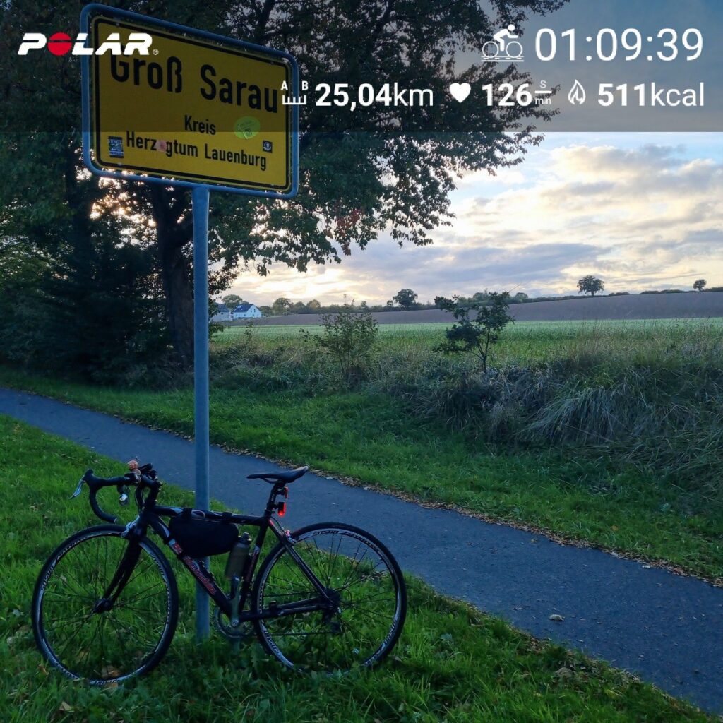 Am frühen Abend waren rund 14 °C, Ich bin mit Langarmtrikot und Laufhose über der Bib gefahren, weil ich nur eine kurze Bib habe. Trotzdem wurde es mit der Zeit schon ganz schön frisch und das Wasser in der Trinkflasche war kalt. Fühlt sich irgendwie an, als wäre das meine letzte Ausfahrt in diesem Jahr gewesen …